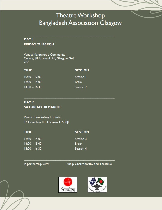 We're excited to inform you that the Bangladesh Association Glasgow is hosting a two-day theatre workshop over the Easter holidays next week. This event will be led by the acclaimed theatre director, Sudip Chakroborthy, along with the distinguished TheatrEX group from Bangladesh. The workshop promises to offer a wealth of benefits that extend into various aspects of our lives. If you’re keen on joining us, please take a moment to complete this quick survey: https://forms.office.com/e/nuyi2JFJu6.